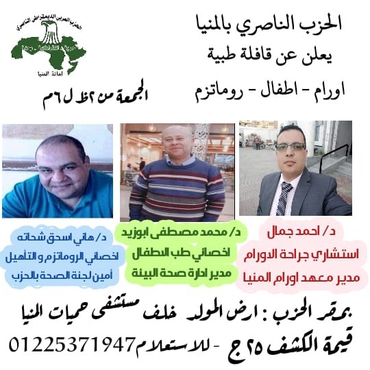 الحزب الناصري بالمنيا يعلن عن تنظيم قافلة طبية إسبوعيا لخدمة المرضى بأسعار رمزية ضمن مبادرة " حياة كريمة " كتب - ماهر الحسيني : أعلن الحزب العربي الديمقراطي الناصري بمحافظة المنيا ، عن تنظيم واقامة قافلة طبية ...المزيد من التفاصيل