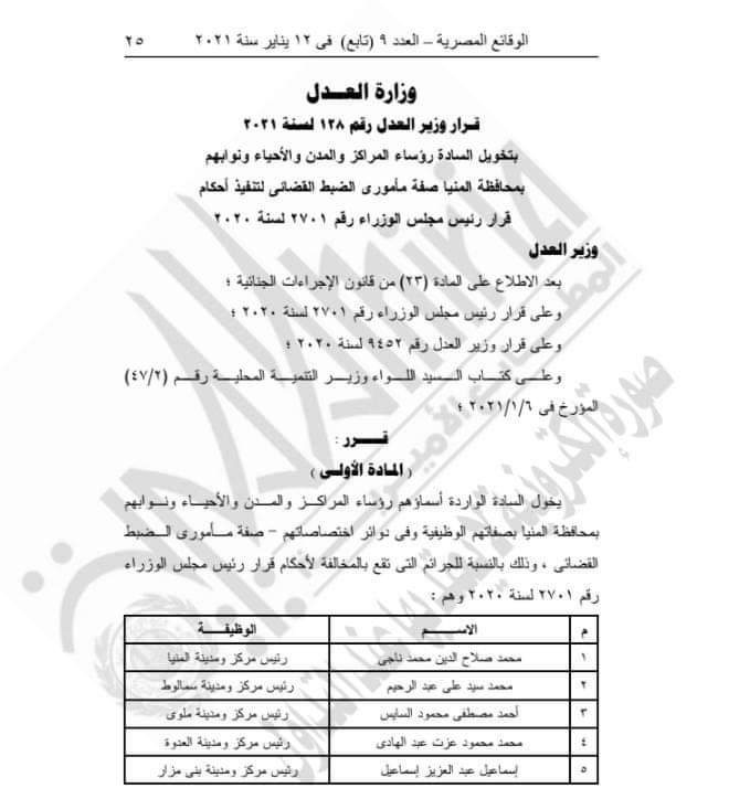 بالأسماء: 23 رئيس مركز ومدينة ونوابهم ب 9 مراكز بمحافظة المنيا يمنحون سلطة الضبط القضائي قرارات مجلس الوزراء.. مدبولي يحدد 18 مكانا يلزم فيها ارتداء الكمامة كتب: نشرت الجريدة الرسمية اليوم قرار وزير العدل رقم 281 بمنح سلط ...المزيد من التفاصيل