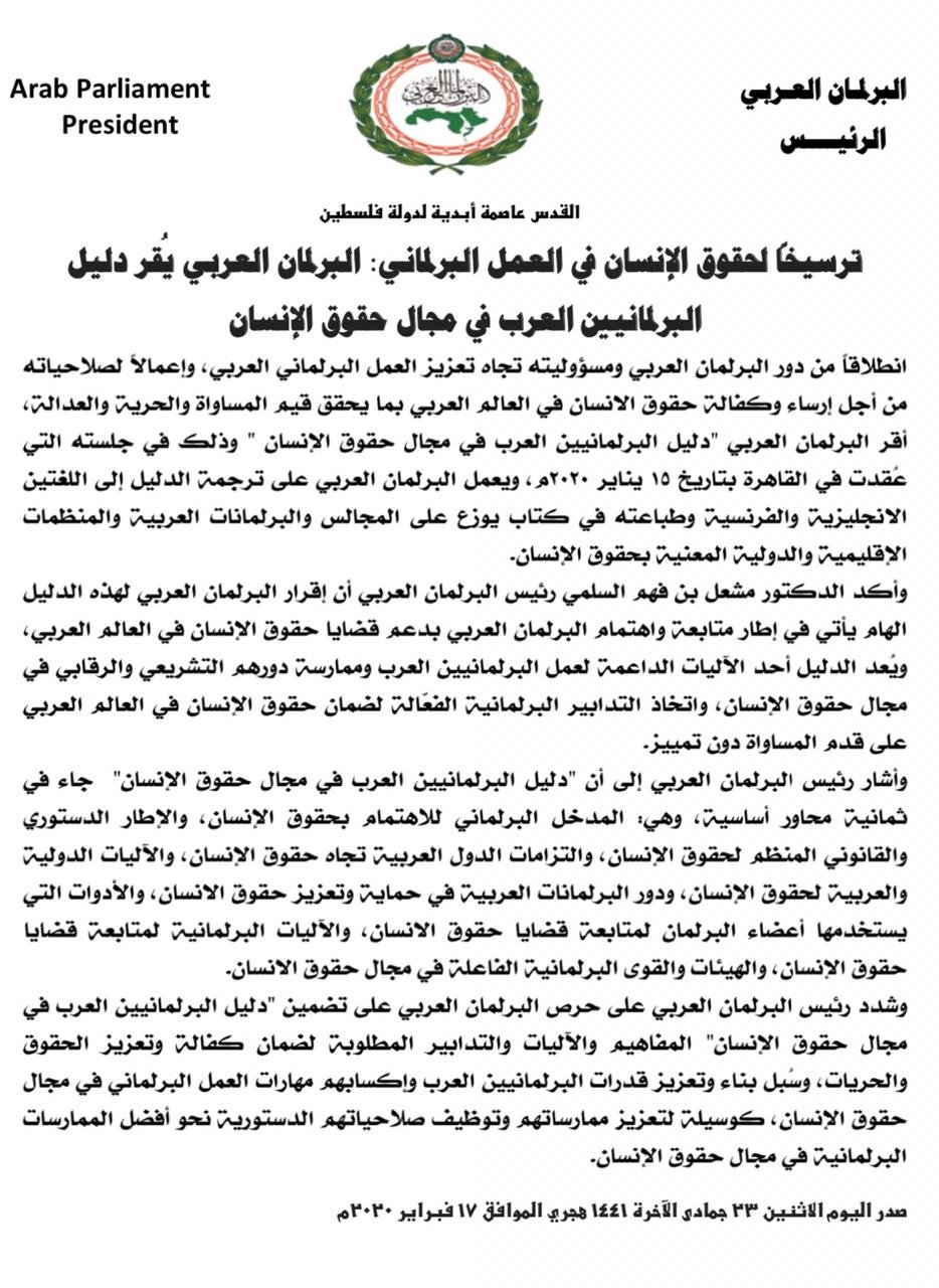 كتبت /ياسمين رجب : انطلاقاً من دور البرلمان العربي ومسؤوليته تجاه تعزيز العمل البرلماني العربي، وإعمالاً لصلاحياته من أجل إرساء وكفالة حقوق الانسان في العالم العربي بما يحقق قيم المساواة والحرية والعدالة، أقر البرلمان العربي "دليل البرلماني ...المزيد من التفاصيل